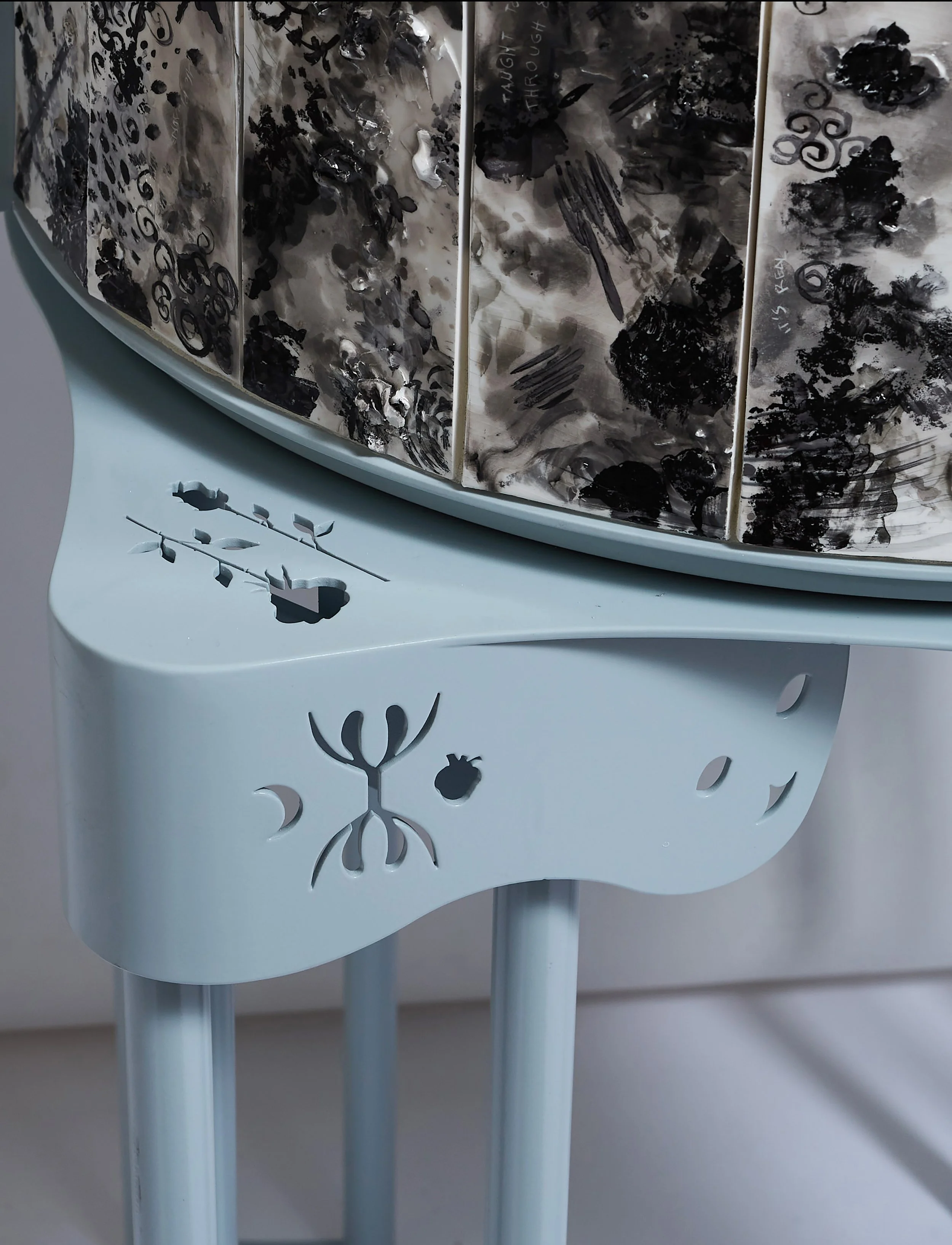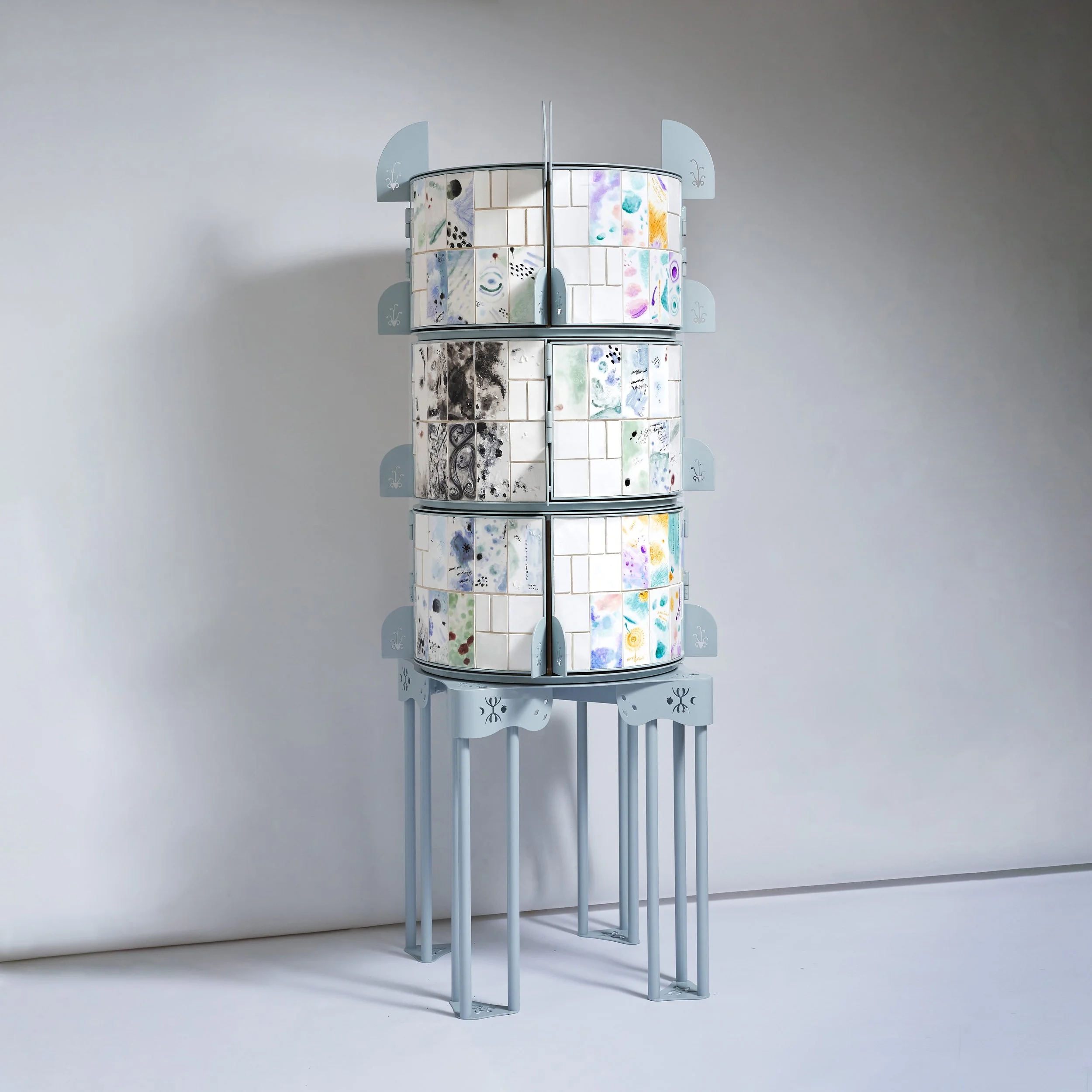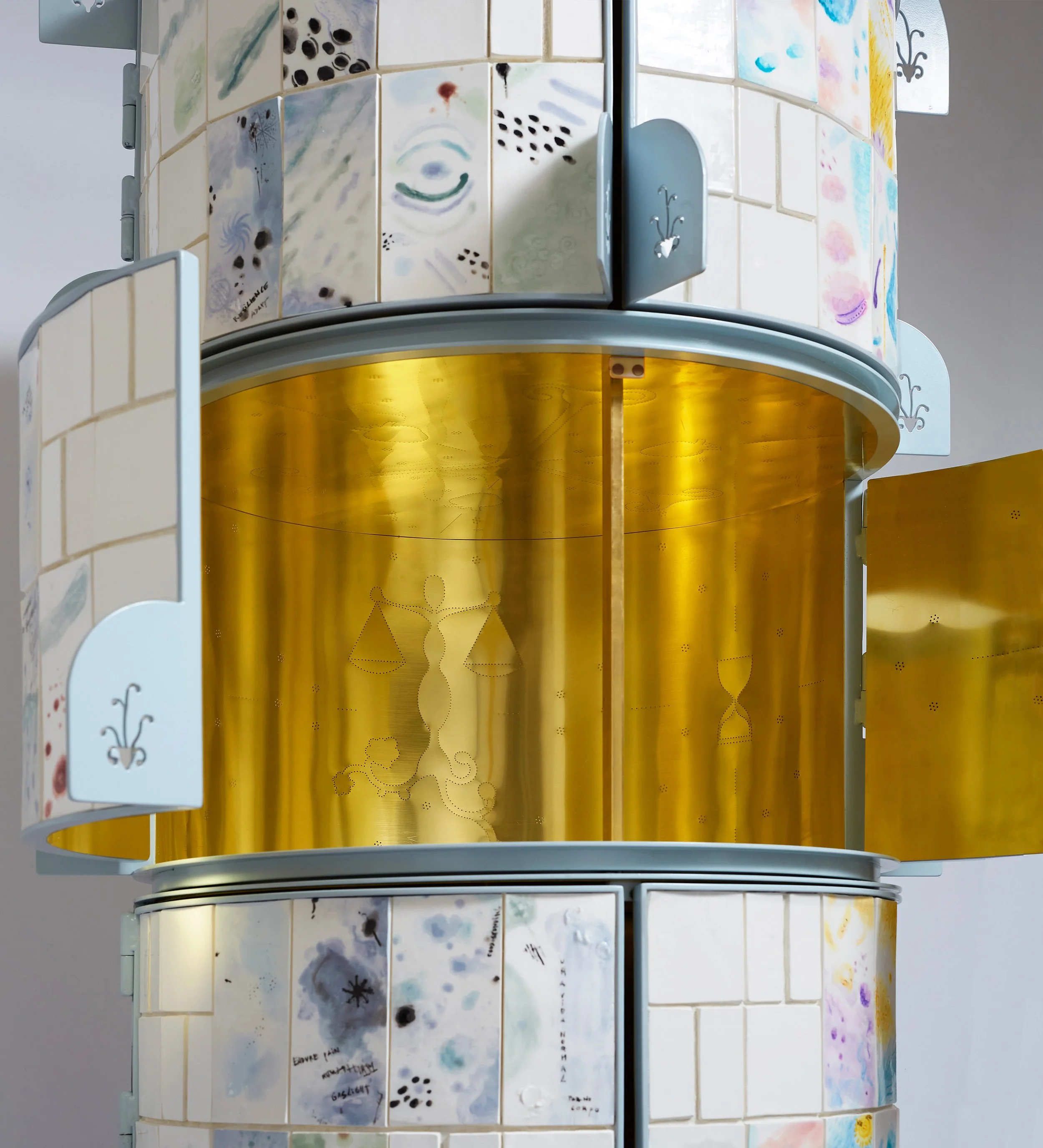 The form and symbolism of the piece are rooted in spiritual and devotional design traditions. I drew inspiration from the Portuguese Oratório Doméstico, the small household altar common in Portuguese and Brazilian homes, the Japanese Butsudan, and the Tibetan prayer wheel. These influences converge in the cabinet’s structure: three large rotating drums with oversized handles allow the façade to be physically reconfigured. This shifting composition mirrors the cyclical, unpredictable rhythms of chronic illness and invites viewers to engage with the work through movement and contemplation.
