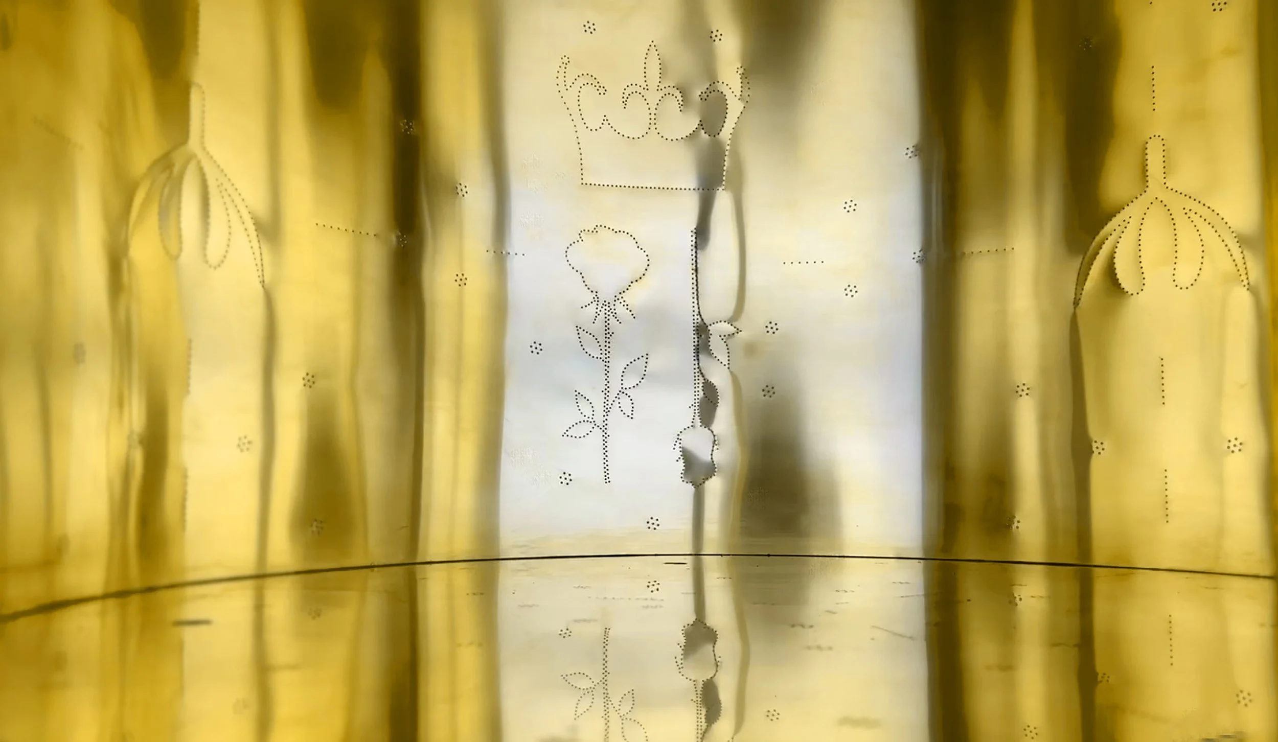 Inside the cabinet, the tone shifts. The interior is lined with brass panels, engraved with symbolic motifs of health, justice, and bodily autonomy. This lining reflects a warm, golden glow, a gesture of sanctity for the intimate items that may be kept inside. The cabinet sits on a four-legged plinth, with sculpted female faces on each leg. These faces stand as quiet sentinels of solidarity, strength, and presence.