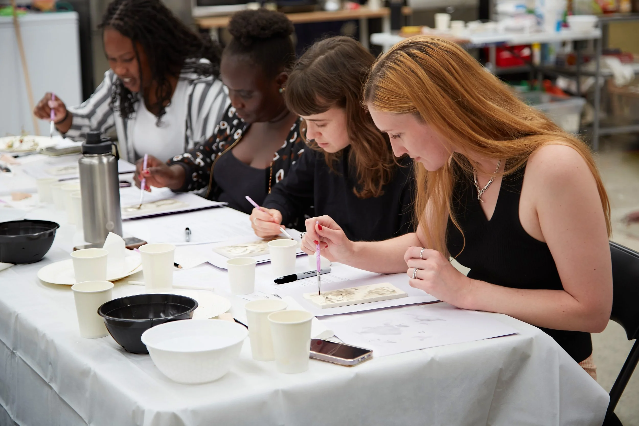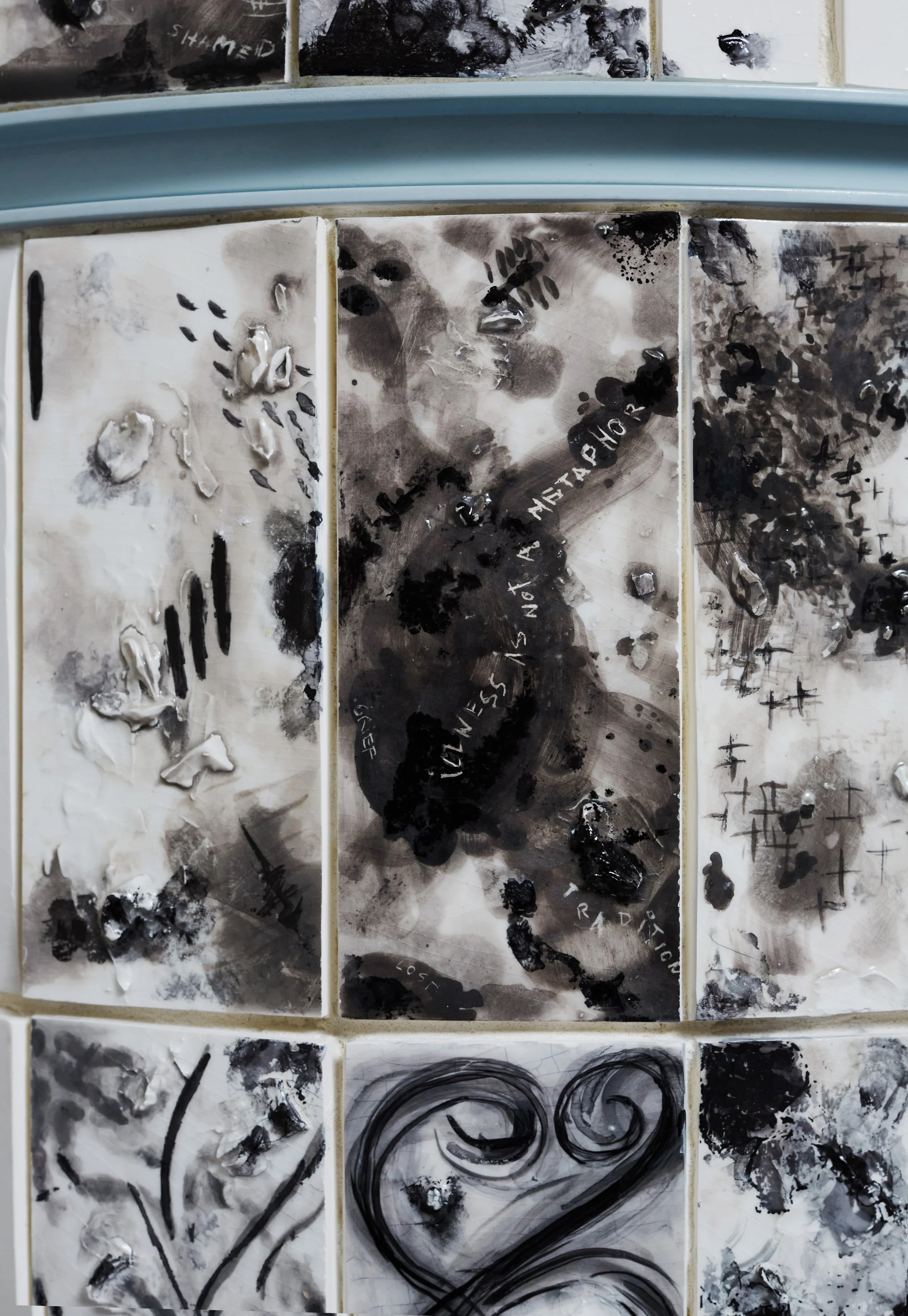 The tiles themselves are inspired by azulejos, the traditional hand-painted tiles found in Portuguese architecture, long used to communicate knowledge, values, and shared memory. I was drawn to their role in storytelling, not simply as decoration, but as vessels of culture and resilience. In this work, the azulejo becomes a feminist surface, one that carries lived truths across time and space.